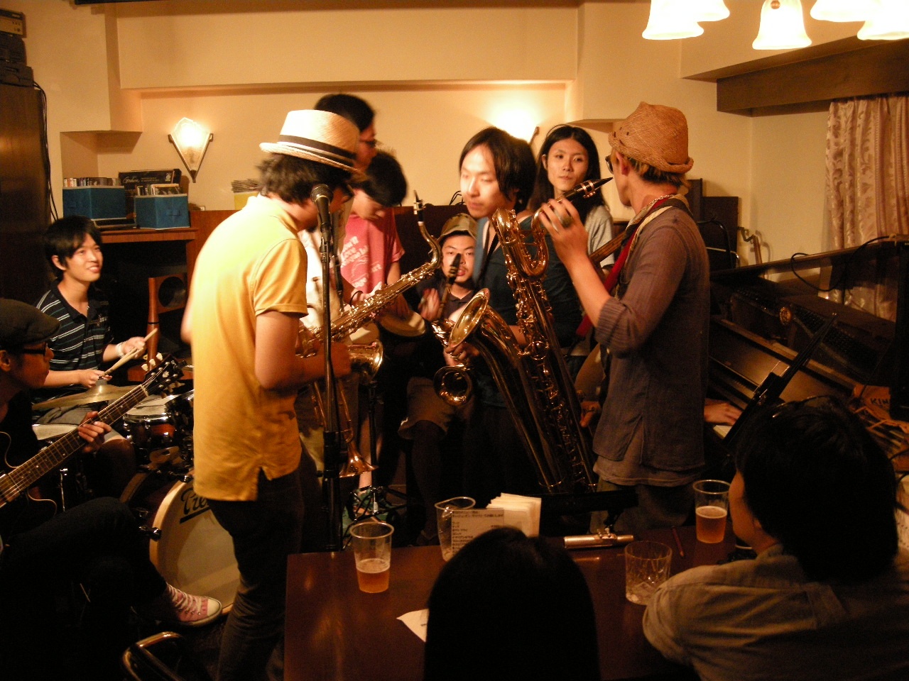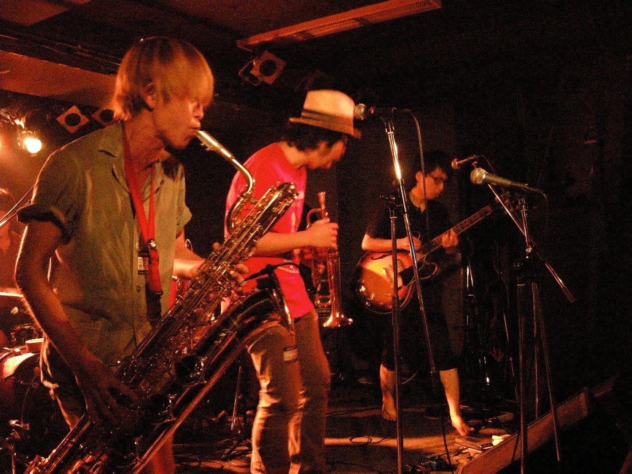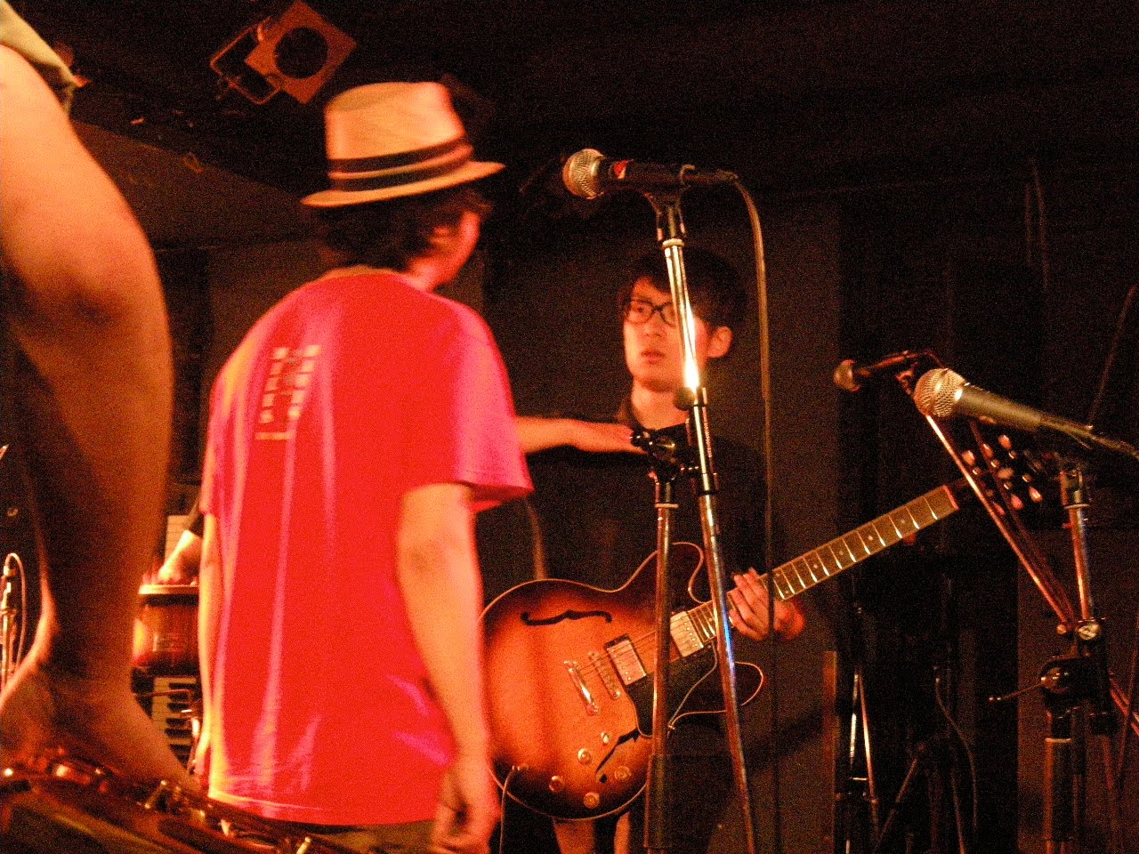 思い出野郎ですどうも。なんかこの日は狭いところで(失礼?)やるためにホーンは生音だったのですが妙に評判よかった。うれしいですね。ところでこれオカジマさんが見切れています。なぜこう撮った
